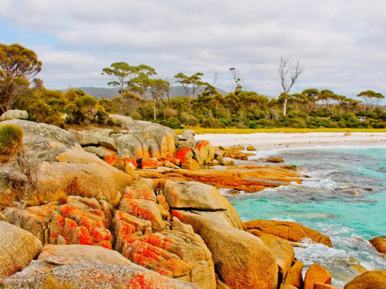 The Bay of Fires is one of Tasmania’s most picturesque beaches, known for its white sand, crystal-clear waters, and striking orange-hued rocks. The area is perfect for swimming, snorkeling, and relaxing in the beautiful natural surroundings.